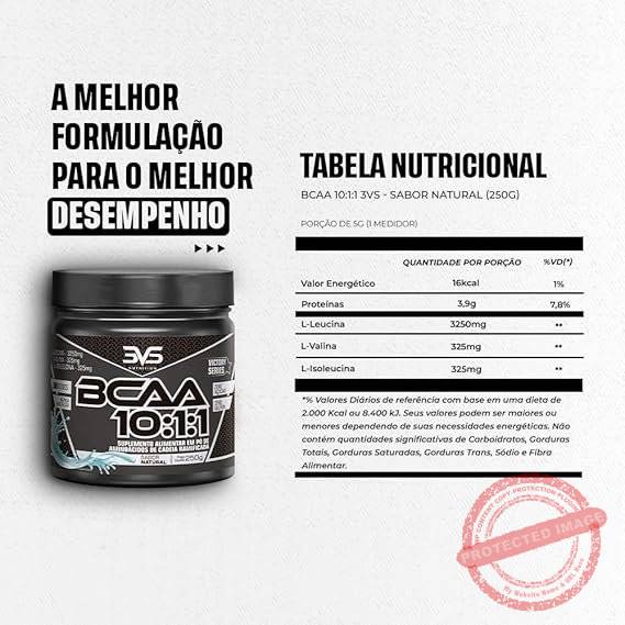 - Sugestão de uso: Adicione 1 dosador (5g) de BCAA 10:1:1 em 100 ml de água, consuma cerca de 30 minutos antes do treino e tome outra dose logo após a atividade física.
