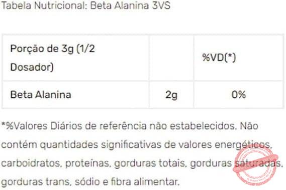 | Aditivos | 100% Beta Alanina “NÃO CONTÉM GLÚTEN” |