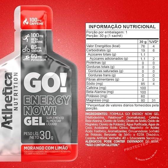 Morango com Limão: FORMULA GO! ENERGY NOW GEL [Maltodextrina, Palatinose (Isomaltulose), Cafeína, Beta-Alanina, Cloreto de Sódio, Citrato de Sódio, Óxido de Magnésio, Cloreto de Potássio], Água Purificada, Água de Coco, Acidulante Ácido Cítrico, Regulador de Acidez Ácido Fosfórico, Aromatizantes, Conservadores Sorbato de Potássio, Benzoato de Sódio e EDTA Dissódico, Corante Artificial Vermelho 40 e Edulcorante Sucralose. “NÃO CONTÉM GLÚTEN.” “ALÉRGICOS: PODE CONTER DERIVADOS DE SOJA.”