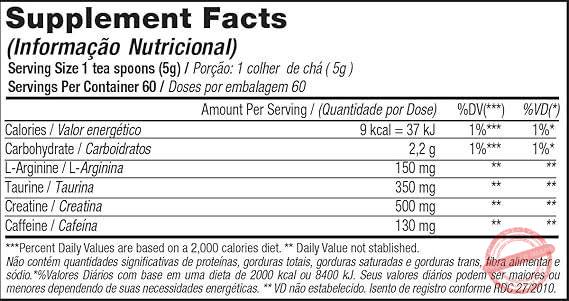 Maltodextrina, creatina monohidratada, taurina, arginina, cafeína, aromatizantes, antiumectante dióxido de silício, edulcorante sucralose, emulsificante goma xantana e corante artificial vermelho 40. NÃO CONTEM GLÚTEN.