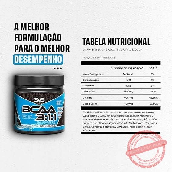BCAA 3: 1: 1 3VS Nutrition é feito a partir de aminoácidos de cadeia ramificada, sua suplementação ajuda na síntese proteica, recuperação muscular e auxiliando na proteção contra o catabolismo. BCAA 3: 1: 1 possui a concentração de 3 partes de leucina para 1 parte de isoleucina e 1 parte de valina. Além disso, conta com uma pequena dose de waxy maize que também auxilia no fornecimento de energia.