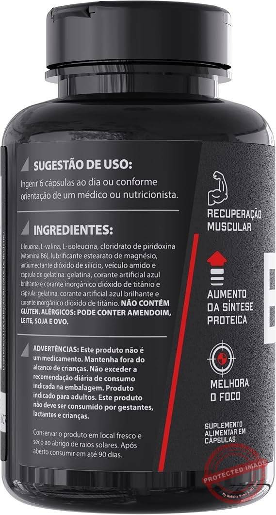 L-leucina, l-valina, L-isoleucina, cloridrato de piridoxina (vitamina B6) lubrificante estearato de magnésio, antiumectante dióxido de silício, veículo amido e cápsula de gelatina: gelatina, corante inorgânico dióxido de titânio e corante inorgânico dióxido de titânio. NÃO CONTÉM GLÚTEN.