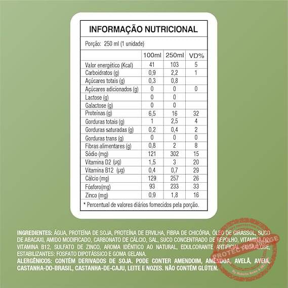 | Ingredientes | Ingredientes: Água, Proteína de soja, Proteína de ervilha, Fibra de chicória, Suco concentrado de abacaxi, Amido modificado, Café solúvel em pó, Óleo de girassol, Carbonato de cálcio, Sal, Suco concentrado de repolho, Vitamina D2, Vitamina B12, Aroma idêntico ao natural, Edulcorante artificial sucralose, Estabilizantes: goma gelana e fosfato dipotássico. |