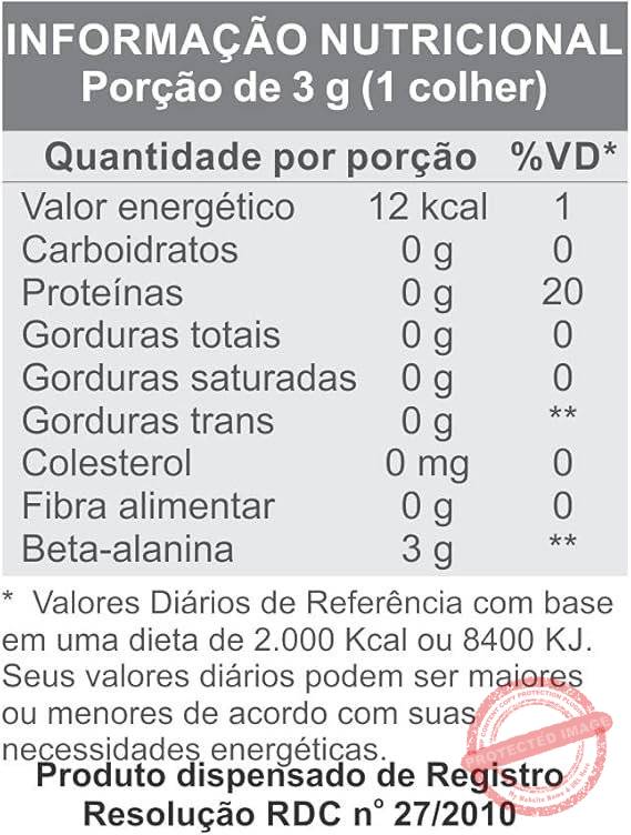 Para performance atlética usualmente é indicado a dose de 3 g (meia colher de chá) a 6 g (uma colher de chá) por dia ou conforme a indicação de especialista. Para tanto, diluir 3 g da Beta Alanina em 200 ml de água ou outra bebida de sua preferência e tomar antes do treino.