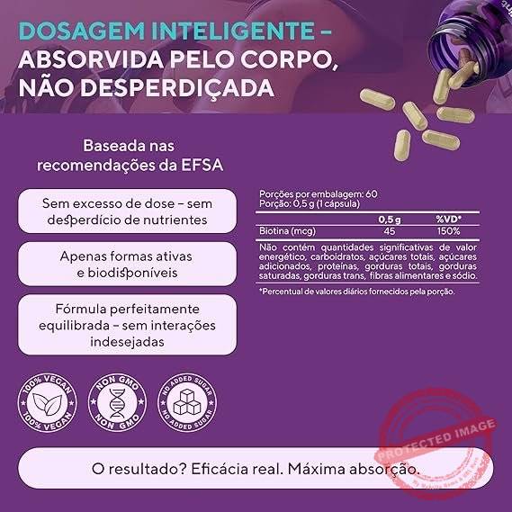 - 🌟 BIOTINA EM DOSE DEFINIDA – Cada cápsula fornece 45 mcg de biotina. Suplemento vitamínico formulado para complementar a ingestão diária dessa vitamina.