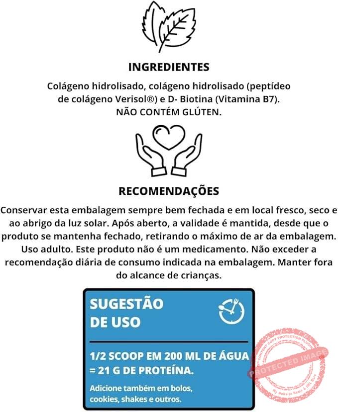 Principal funçãoCOLLAGEN PROTEIN é particularmente útil na maturidade, quando nossos mecanismos naturais de assimilação e transporte de proteínas estão menos eficientes, e a saúde é beneficiada por um aporte maior deste importante nutriente. Seu blend de aminoácidos é ideal par a complementar o aporte diário de proteína, ajudando a oferecer ao corpo matéria-prima para músculos, enzimas digestivas, renovação de órgãos, tecidos, articulações, ossos e saúde cerebral, além de componentes fundamentais para o sistema imune. E, naturalmente, o COLLAGEN PROTEIN também contribui diretamente para a saúde e beleza da pele, das unhas e dos cabelos.Principais ativosVitamina B7 (Biotina), Colágeno hidrolisado, peptídeos de colágeno (Verisol)Modo de uso01/02 sccop +200ml agua/leite/suco= 21g proteina