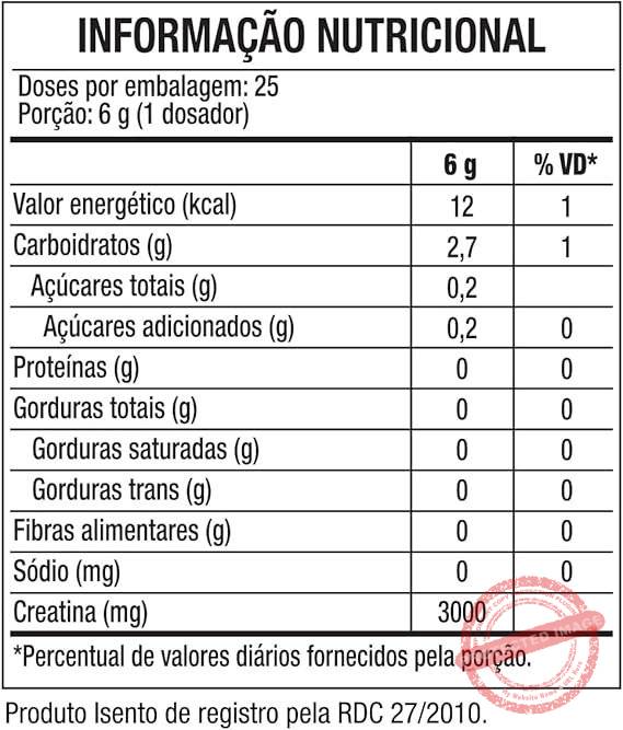 | Aditivos | creatina monoidratada, maltodextrina, acidulante ácido cítrico, aromatizante, corante urucum e edulcorante sucralose. NÃO CONTÉM LACTOSE. NÃO CONTÉM GLÚTEN. |