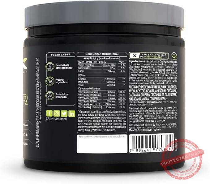 O BCAA Powder da Dux Nutrition possui uma fórmula avançada à base de BCAAs na proporção 4:1:1 (quatro partes de Leucina, uma parte de Isoleucina e uma parte de Valina), aditivada com uma mistura excepcional de eletrólitos e complexo vitamínico, para entregar desempenho máximo em treinos e competições. A proteína, um dos três macronutrientes essenciais para o corpo, é formada por 20 aminoácidos, sendo que os 3 mais importantes (Leucina, Isoleucina e Valina) não são produzidos por nosso organismo. Eles auxiliam o atleta em treinos e competições, melhorando o desempenho, prevenindo o catabolismo muscular e estimulando a síntese proteica. BENEFÍCIOS: > Matéria-prima importada, vegetal, de grau farmacêutico (a maioria dos BCAAs de mercado é feita com penas de pato e pele de porco); > Aditivado com micronutrientes especificamente formulados para atuar no desempenho atlético, construção e proteção muscular; > Combinação perfeita de eletrólitos, que garante hidratação adequada; > Composição funcional, sem ingredientes inofensivos e vegana; > Não contém substâncias ilícitas, goma xantana, espessantes, estabilizantes, conservantes ou qualquer outro ingrediente inferior; > Contém corantes 100% naturais, sem ingredientes artificiais; > Ideal para treinos de força ou com cargas (bodybuilding, crossfit, powerlifting e artes marciais), esportes de alto rendimento (triathlon, ciclismo, corrida e natação) e esportes de explosão e parada (artes marciais, basquete, tênis e futebol).