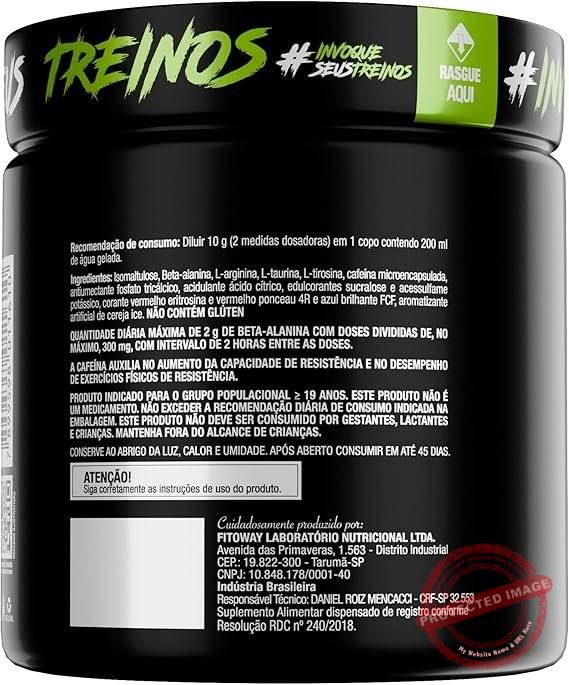 Nome do produto Diabo Verde Pre – Workout Nova Fórmula- 300G Cereja Ice – Ftw Informações sobre alergia Não contém glúten, Não contém lactose Unidades 300 unidade Porção recomendada Diluir 2 medidas dosadoras (10g) em 200ml de água gelada. Consumir 30 minutos antes da atividade física. A dose diária máxima de beta-alanina é de 2g, podendo ser dividida com intervalo mínimo de 2 horas entre as porções. Marca FTW Formato Pó Descrição da faixa etária Adulto Número de unidades 1 Tamanho 300g / Sabor – Cereja Ice Fabricante Fitoway Número do modelo FTW-PTDV02 Dimensões do produto 11 x 11 x 12 cm; 300 g ASIN B09SJQT577 Funciona a bateria ou pilha? Não EAN 7899598011610 - Dimensões do produto : 11 x 11 x 12 cm; 300 g