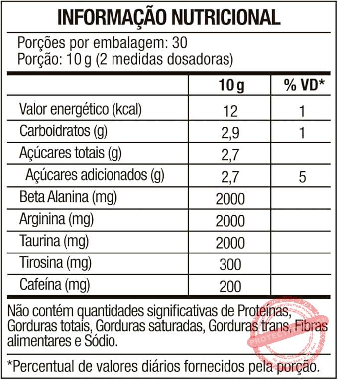 Ingredientes: Isomaltulose, Beta-Alanina, L-arginina, L-taurina, L-tirosina, cafeína micro encapsulada, antiumectante fosfato tricálcico, acidulante ácido cítrico, edulcorantes sucralose e acessulfame potássico, corante vermelho allura e aromatizante artificial de energético.