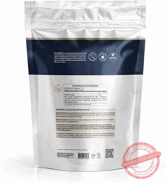 INGREDIENTES: L-Glutamina. NÃO CONTÉM GLÚTEN. SUGESTÃO DE USO: Dissolva 5g ao dia, em aproximadamente 300ml de água gelada ou suco de sua preferência. Ou de acordo com recomendação médica.
