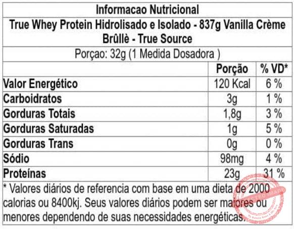 | Nome do produto | True Whey (837g) – Hidrolisado e Isolado – Vanilla Creme Brulle |