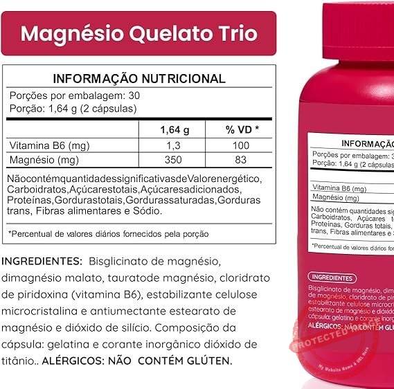 • Magnésio Trio: Fórmula com três tipos de magnésio quelato (dimalato, bisglicinato e taurato) para garantir maior absorção e benefícios para o seu corpo.