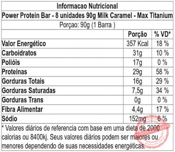 | Nome do produto | POWER PROTEIN BAR MILK CARAMEL 8 UN DE 90G |