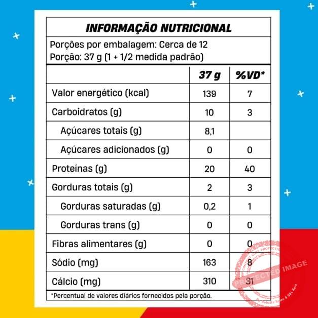 Proteína de soro do leite concentrada, amendoim torrado e moído, sal, aroma sintético idêntico ao natural, espessante goma xantana e edulcorante sucralose.