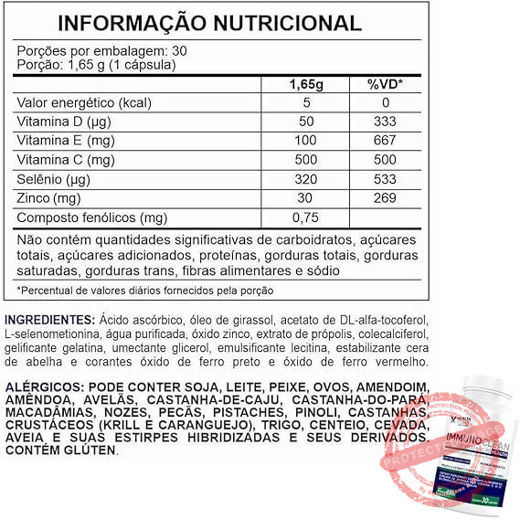 Ácido ascórbico, óleo de girassol, acetato de DL-alfa-tocoferol, L-selenometionina, água purificada, óxido zinco, extrato de própolis, colecalciferol, gelificante gelatina, umectante glicerol, emulsificante lecitina, estabilizante cera de abelha e corantes óxido de ferro preto e óxido de ferro vermelho. Alérgicos: Pode conter soja, leite, peixe, ovos, amendoim, amêndoa, avelãs, castanha de caju, castanha do pará, macadâmias, nozes, pecãs, pistaches, pinoli, castanhas, crustáceos (krill e caranguejo), trigo, centeio, cevada, aveia e suas estirpes hibridizadas e seus derivados. CONTÉM GLÚTEN. Este produto não é um medicamento. Dispensa registro conforme RCD 27/2010.