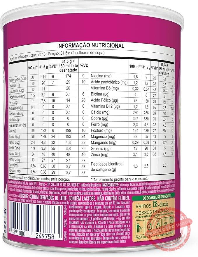 Leite em pó desnatado, maltodextrina, peptídeos bioativos de colágeno hidrolisado com peso molecular médio de 2kDa, minerais (fosfato de cálcio tribásico, óxido de magnésio, pirofosfato férrico, óxido de zinco, sulfato cúprico, sulfato de manganês e selenito de sódio), vitaminas (L ascorbato de sódio, acetado de DL-alfa-tocoferila, nicotinamida, D-pantotenato de cálcio, cloridrato de piridoxina, cloridrato de tiamina, palmitato de retinila, riboflavina, ácido fólico, fitomenadiona, D biotina, colecalciferol e cianocobalamina), aromatizante e edulcorante sucralose.