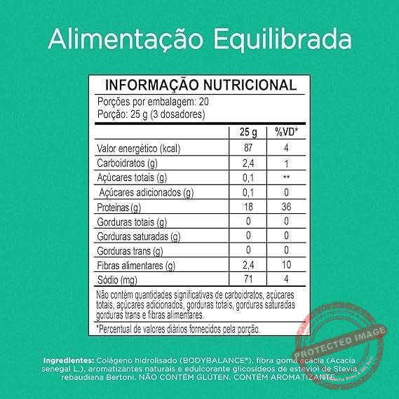 Colágeno hidrolisado (BODYBALANCE®), fibra goma acácia (Acacia senegal L.), aromatizantes naturais e edulcorante glicosídeos de esteviol de Stevia rebaudiana Berton