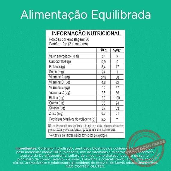 : Colágeno hidrolisado, colágeno hidrolisado bioativo (Verisol®), mix de vitaminas e minerais [vitamina C (ácido ascórbico), vitamina E (DL alfa-acetato de tocoferol), zinco (sulfato de zinco mono-hidratado), vitamina A (acetato de retinol), cromo (picolinato de cromo), selênio (selenito de sódio), vitamina H (biotina) e vitamina D (colecalciferol)], acidulante ácido cítrico, aroma sintético idêntico ao natural, edulcorante estévia e corante betacaroteno