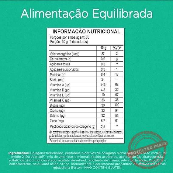 : Colágeno hidrolisado, colágeno hidrolisado bioativo (Verisol®), mix de vitaminas e minerais [vitamina C (ácido ascórbico), vitamina E (DL alfa-acetato de tocoferol), zinco (sulfato de zinco mono-hidratado), vitamina A (acetato de retinol), cromo (picolinato de cromo), selênio (selenito de sódio), vitamina H (biotina) e vitamina D (colecalciferol)], acidulante ácido cítrico, aroma sintético idêntico ao natural, edulcorante estévia e corante betacaroteno