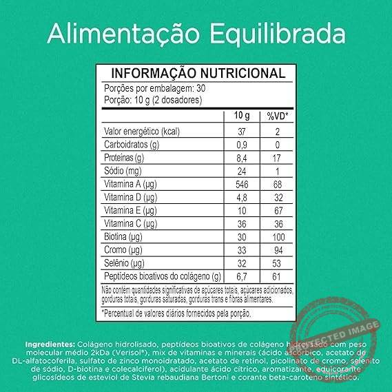 : Colágeno hidrolisado, colágeno hidrolisado bioativo (Verisol®), mix de vitaminas e minerais [vitamina C (ácido ascórbico), vitamina E (DL alfa-acetato de tocoferol), zinco (sulfato de zinco mono-hidratado), vitamina A (acetato de retinol), cromo (picolinato de cromo), selênio (selenito de sódio), vitamina H (biotina) e vitamina D (colecalciferol)], acidulante ácido cítrico, aroma sintético idêntico ao natural, edulcorante estévia e corante betacaroteno