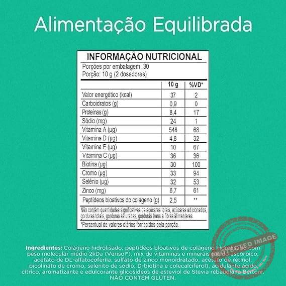 : Colágeno hidrolisado, colágeno hidrolisado bioativo (Verisol®), mix de vitaminas e minerais [vitamina C (ácido ascórbico), vitamina E (DL alfa-acetato de tocoferol), zinco (sulfato de zinco mono-hidratado), vitamina A (acetato de retinol), cromo (picolinato de cromo), selênio (selenito de sódio), vitamina H (biotina) e vitamina D (colecalciferol)], acidulante ácido cítrico, aroma sintético idêntico ao natural, edulcorante estévia e corante betacaroteno