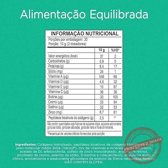 : Colágeno hidrolisado, colágeno hidrolisado bioativo (Verisol®), mix de vitaminas e minerais [vitamina C (ácido ascórbico), vitamina E (DL alfa-acetato de tocoferol), zinco (sulfato de zinco mono-hidratado), vitamina A (acetato de retinol), cromo (picolinato de cromo), selênio (selenito de sódio), vitamina H (biotina) e vitamina D (colecalciferol)], acidulante ácido cítrico, aroma sintético idêntico ao natural, edulcorante estévia e corante betacaroteno