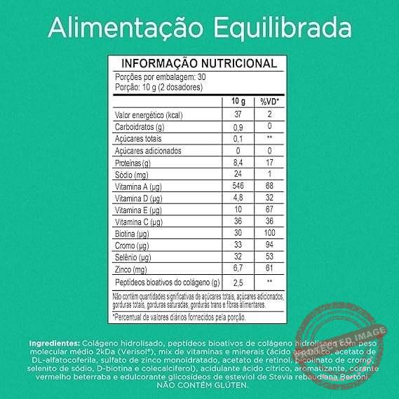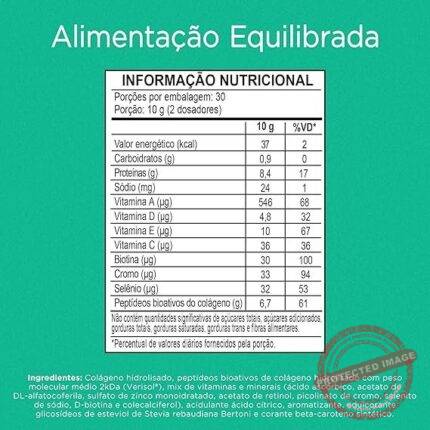 : Colágeno hidrolisado, colágeno hidrolisado bioativo (Verisol®), mix de vitaminas e minerais [vitamina C (ácido ascórbico), vitamina E (DL alfa-acetato de tocoferol), zinco (sulfato de zinco mono-hidratado), vitamina A (acetato de retinol), cromo (picolinato de cromo), selênio (selenito de sódio), vitamina H (biotina) e vitamina D (colecalciferol)], acidulante ácido cítrico, aroma sintético idêntico ao natural, edulcorante estévia e corante betacaroteno