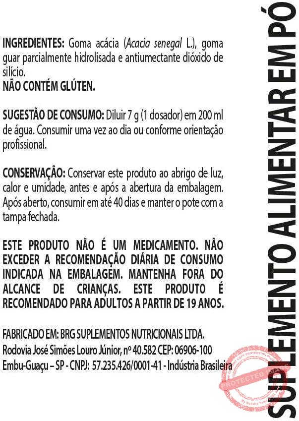 Sugestão de Consumo:Diluir 7g (1 dosador) em 200ml de água. Consumir uma vez por dia ou conforme orientação profissional.Ingredientes Fibra goma acácia (Acacia senegal L.), fibra goma guar parcialmente hidrolisada e antiumectante dióxido de silício. NÃO CONTÉM GLÚTEN Não contém quantidades significativas de valor energético, carboidratos, proteínas, gorduras totais, gorduras saturadas e gorduras trans.