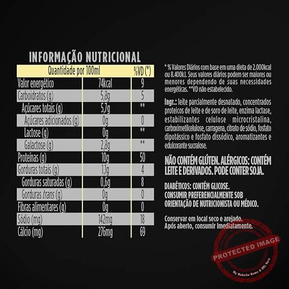 | Ingredientes | Leite parcialmente desnatado, concentrados proteicos de leite e de soro de leite em pó, enzima lactase, estabilizantes celulose microcristalina, carboximetilcelulose sódica, carragena, citrato trissódico, fosfatos dipotássico e dissódico, aromatizantes e edulcorante artificial sucralose. |