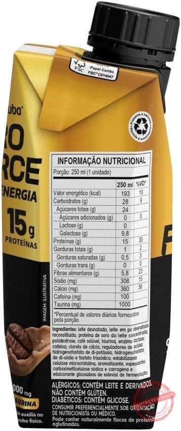 | Ingredientes | Leite desnatado, leite em pó desnatado reconstituído, proteína de soro do leite concentrada, polidextrose, café solúvel, taurina, enzima lactase, cafeína, cloreto de cálcio, reguladores de acidez hidrogenofosfato de di-potássio, hidrogenofosfato de di-sódio e fosfato trissódico, estabilizante celulose microcristalina, aromatizante, espessantes carboximetilcelulose sódica e carragena e edulcorante glicosídeos de esteviol de fermentação. |
