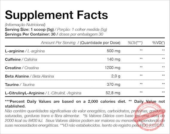 MODO DE CONSUMO: Misture uma colher medida 5g em 150ml de água ao dia. Ou como indicar seu médico ou nutricionista. INGREDIENTES: Beta alanina, creatina monohidratada, arginina, taurina, cafeína anidra, C. Crispus invernal, acidulante ácido cítrico, aromatizantes, antiumectante dióxido de silício, edulcorante sucralose e corantes artificiais. NÃO CONTÉM LACTOSE. NÃO CONTÉM GLÚTEN