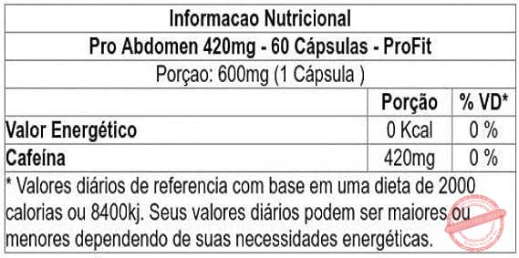 PRO ABDOMEN é um potente termogênico que propõe maior disposição física e mental gerando mais energia para treinos intensos. A fórmula ultra concentrada de PRO ABDOMEN contém ingredientes que auxiliam a disposição, performance, rendimento físico e associados a uma dieta e estilo de vida saudáveis, favorecem a metabolização da gordura corporal. SUGESTÃO DE USO: Ingerir 1 cápsula ao 30 minutos antes dos treinos. Não exceder a dose recomendada do produto. INGREDIENTES: Cafeína Anidra, excipientes dióxido de silício, estearato de magnésio, veiculo cápsula: gelatina, água purificada, corantes artificiais (azul brilhante, eritrosina e tartrazina), e corante inorgânico dióxido de titânio.