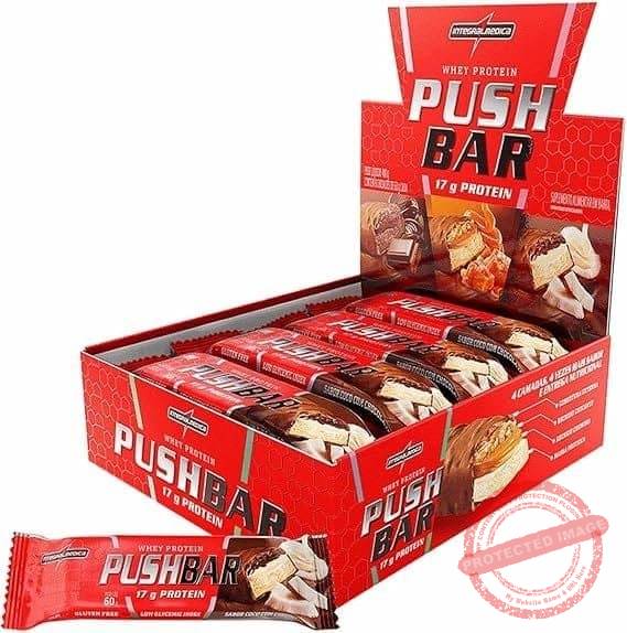 Push Bar (480g) Para uma perfeita reposição proteica que auxiliará na melhora do seu desempenho, chegou Push Bar. Push Bar é a barra que contém alta concentração de proteínas, baixo índice glicêmico, adicionada de vitaminas, TCM (triglicerídeos de cadeia média) e não contém glúten. É uma barra com a fórmula ideal para uma reposição proteica que pode ser consumida no período pós e pré-treino, além de também ser um perfeito substituto para as refeições intermediarias ao longo do dia. Contém whey protein, que é uma proteína de alta qualidade e que entrega grande concentração de aminoácidos essenciais em sua composição. Benefícios: – 17g de proteínas;- Manutenção da massa muscular;- Reposição proteica;- Reposição energética- Refeição intermediaria;- Com Whey Protein;- 4 camadas, 4 vezes mais sabor.