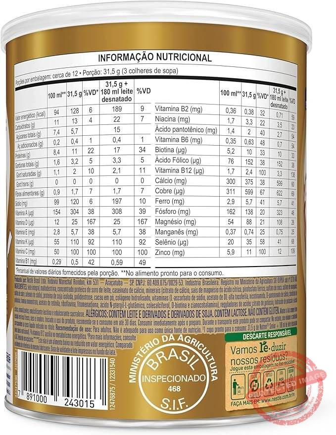 Leite integral, maltodextrina, concentrado proteico de soro de leite, caseinato de cálcio, minerais (citrato de cálcio, sais de magnésio do ácido cítrico, pirofosfato férrico, sulfato de zinco, sulfato de manganês, sulfato de cobre e selenato de sódio), proteína de soja isolada, polidextrose, cacau em pó, colágeno hidrolisado, vitaminas (L-ascorbato de sódio, acetato de DL-alfa-tocoferila, nicotinamida, D-pantotenato de cálcio, cloridrato de piridoxina, tiamina mononitrato, acetato de retinila, riboflavina, fitomenadiona, ácido N-pteroil-L-glutâmico, colecalciferol, D-biotina e cianocobalamina), reguladores de acidez citrato de potássio, hidróxido de potássio e ácido cítrico, aromatizantes, emulsificante lecitina e edulcorante sucralose.