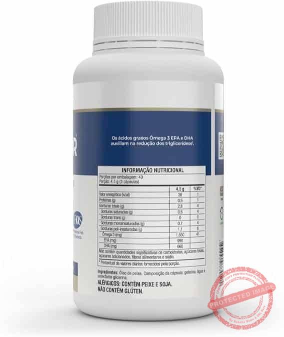 Óleo de peixe (ômega 3) em cápsulas. Produto a base de óleo de peixe extraído de águas frias, profundas e não poluídas, sendo rico em ácidos graxos de cadeia longa, da série ômega 3. Possui alta concentração de seus derivados, ácido eicosapentaenoico (EPA) – 990mg e ácido docosahexaenoico (DHA) – 660mg. Possui a certificação IFOS- International Fish Oil Standards Program. Com certificação do Programa Internacional de Padrões de Óleo de Peixe (IFOS ). Único programa de testes e certificação de terceiros para óleos de peixe. Definindo os padrões mais altos do mundo em pureza, potência e frescor.