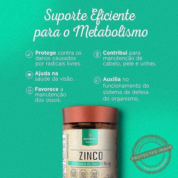 Zinco (60 caps) O Zinco é um mineral envolvido em inúmeras reações enzimáticas e metabólicas e por isso seu consumo é tão importante. Zinco Nutrify apresenta-se em cápsulas, na forma de bisglicinato, uma fonte altamente absorvível do zinco (96 mg de bisglicinato de zinco fornecem 29,59 mg de zinco). Com matéria-prima vegana e cápsulas vegetais, sendo perfeito também para quem não consome ingredientes de origem animal.Benefícios: – Essencial para o funcionamento do sistema imunológico:- Contribui para a manutenção do cabelo, da pele e das unhas:- Auxilia no tratamento de acnes e eczema:- Atua na produção de hormônios:- Combate ao envelhecimento precoce: