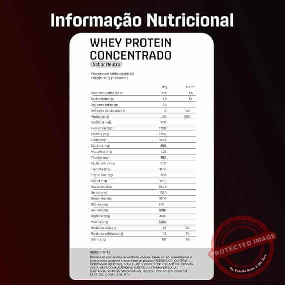 Proteína concentrada do soro do leite e emulsificante lecitina de soja. CONTÉM LACTOSE. CONTÉM GLÚTEN. ALÉRGICOS: CONTÉM DERIVADOS DE LEITE E SOJA. PODE CONTER TRIGO, AVEIA, CEVADA, CENTEIO, AMENDOIM, AVELÃ, MACADÃMIA, NOZES, CASTANHA-DE-CAJU, E CASTANHA-DO-PARÁ.