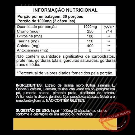 Extrato de laranja moro (Citrus sinensis L Osbeck), cafeina, L-tirosina, taurina, chá verde em pó, gengibre em po, pimenta caiena, pimenta preta, picolinato de cromo Antiumectante dióxido de silício, Cromo (mcg) 250, L-tirosina (mg) 100, Taurina (mg) 150, Cafeina (mg) 400, Antocianinas (mg) 5